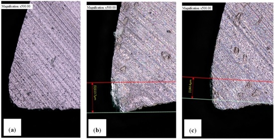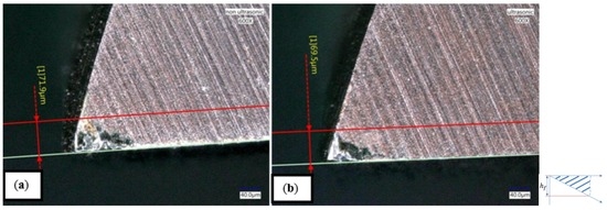 Tool wear is a most important parameter that must be taken into account with respect to the accuracy of a machined component. Accuracy is also reflected by the degree to which the machined surface corresponds to that of the cutting tool with which it was in contact during the process. Optical micrographs of the cutting edges of tools with helix angles of 25°, 35° and 45°, used with and without ultrasonics, are shown in Figure 9, Figure 10 and Figure 11. It was found that tool wear with ultrasonic vibration was less than in conventional milling due to the axial movement of the cutter which periodically increases the gap between the tool and the workpiece which promotes interfacial lubrication. This is similar to the findings of Manjot et al. [14] and Geng et al. [15]. The conclusion is that tools used in ultrasonic-assisted machining last longer.