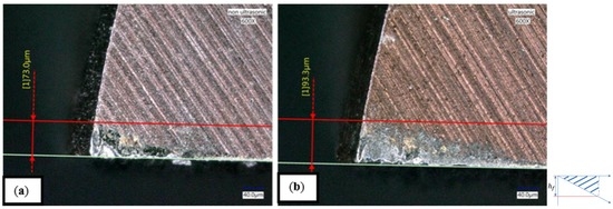 The rake angle controls two important variables, the direction of chip flow and the strength of the force on the tool tip. A positive rake angle, which leads with the cutting edge, will improve the cutting operation by reducing both force and temperature. However, a positive rake angle also exposes the cutting edge to more force over a smaller area and this can lead to chipping and tool failure. A negative rake angle, which leads with the rake surface, makes the tool effectively blunter but the cutting force is distributed over a larger area and more slowly. The effect is to make the tool stronger by reducing the force on the cutting edge. However, the cutting force is higher, as is friction, which raises the temperature. The effect of rake angle of the cutter on the surface roughness of the workpiece was also investigated and the result is shown in Figure 12. As can be seen from the figure, the Ra resulting from the use of a positive rake angle is better than that of a negative rake angle with or without ultrasonic assistance. However, it is interesting to notice that for a negative rake angle the Ra achieved by unassisted milling is better than that reached with ultrasonics. Photomicrographs of the workpiece surfaces are shown in Figure 13 where it is obvious that for a rake angle of −6° the surface quality achieved without ultrasonic assistance is better than that with assistance. This should be taken into account when using ultrasonic-assisted milling. In addition, the optical micrographs in Figure 14 and Figure 15 shows that tool wear is also affected by rake angle and wear with ultrasonic vibration is lower than with unassisted milling, flank wear characterized by wear land (or Height) hf of wear band. This is in agreement with the finds of Liu et al. [16] who pointed out that ultrasonic-assisted milling removes heat more effectively and this reduces wear and prolongs tool life. Tsai et al. [17,18] focused on single crystal silicon carbide and cubic boron nitride (CBN) composites impregnated with micro graphite materials, and also discussion there reaction and wear behaviors. Suárez et al. [19] investigates the effects of ultrasonic vibration-assisted milling on important aspects such us material surface integrity, tool wear, cutting forces and fatigue resistance. Celaya et al. [20] investigated focusing on the effect of tool vibration on surface quality, and also propose a new booster design based on the theory of longitudinal vibration of a bar with varying cross-sectional area for a higher amplification of the ultrasonic vibration.