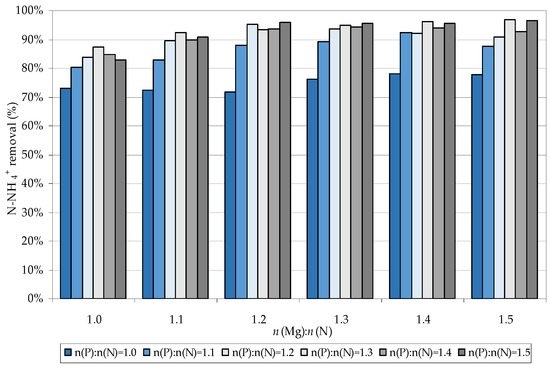 With the aim of identifying the most favorable dosages of magnesium and phosphorous reactants, a set of tests was carried out by testing n(Mg):n(N) and n(P):n(N) ratios between 1 and 1.5. In these tests, all the reagents were instantly dosed. In particular, the pH of mixture was corrected after the initial addition of Mg and P solutions. This operating modality was selected on the basis of our previous works, which demonstrated that the initial setting of pH, followed by the dosages of magnesium and phosphorus, is not suitable for struvite precipitation [34]. Indeed, the acid characteristics of P and Mg reagents, if they were fed after the base addition, produce an instantaneous reduction of pH, which hinders the struvite crystallization. The results of the tests conducted in this study, instead, showed satisfactory process performances with the adopted procedure. In particular, ammonium removals of about 72% were obtained using n(P):n(N) = 1 and adjusting the n(Mg):n(N) ratio between 1 and 1.2 (Figure 1). By holding the phosphorus dosage constant and increasing the magnesium molar amount, the efficiency slightly increased to 78%. The increase of the phosphorus dose to 1.2, for a given n(Mg):n(N) ratio, produced an almost proportional increase in ammonium abatement. This growth was contextually accentuated by the increase of magnesium dosage up to a value of 1.2, reaching maximum abatements close to 95% (Figure 1). The necessity to dose higher amounts of Mg and P reagents, with respect to the stoichiometric ratio (n(N):n(Mg):n(P) = 1:1:1), is imputable to the precipitation, besides to struvite particles, of further salts composed of magnesium and phosphorus, such as magnesium and calcium phosphates [22]. The formation of these products removes some of the Mg2+ and PO43− available for struvite crystallization, therefore, an overdose of reagents is necessary. In further researches, the benefit of overdosing magnesium and phosphorus was verified [18,19,32]. Clearly, the optimal dosages reported in the literature are related to many factors, such as the characteristics of treated wastewaters, the exploited reactants, and the applied process conditions. In the present study, as abovementioned, the highest ammonium abatements were reached with n(N):n(Mg):n(P) = 1:1.2:1.2.