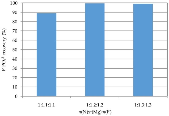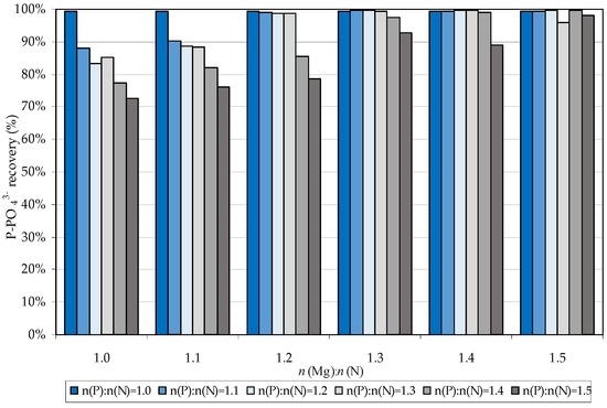 In addition to NH4+ abatement, the phosphorus recovery was monitored since this element is undesirable in treated wastewaters. The recovery performance was always close to 100% for the tests conducted with stoichiometric ratios n(P):n(N) = 1, while it generally decreased with the increase of P addition (Figure 2). These reductions were much more pronounced for the lower magnesium additions (Figure 2). Indeed, as expected, the recovery efficiency is worse when the phosphorus dosage greatly exceeds that of magnesium.