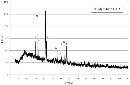 This was confirmed by the XRD analysis of solids recovered after the leachate treatment, which showed mainly the peaks characteristic of struvite, while those representative of MgHPO4∙3H2O were much less pronounced (Figure 11). Furthermore, the results of conducted tests showed that for used amounts of decomposition residues lower than 20%, residual phosphorus and magnesium concentrations were in line with those of raw leachate. Beyond this dosage, moderate increases, up to 35 mg(P)/L and 72 mg(Mg)/L, were observed. These increases are attributable to the dissolved phosphorus and magnesium contained in the liquid phase of struvite residues. On the basis of the above results, an amount of 10% was assumed as optimal for the treatment of raw leachate. Therefore, by considering the humidity (80%) of decomposition products, the actual ratio between the dry struvite residues and leachate is about 2% (w/v).