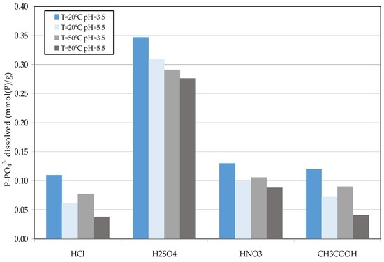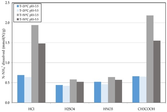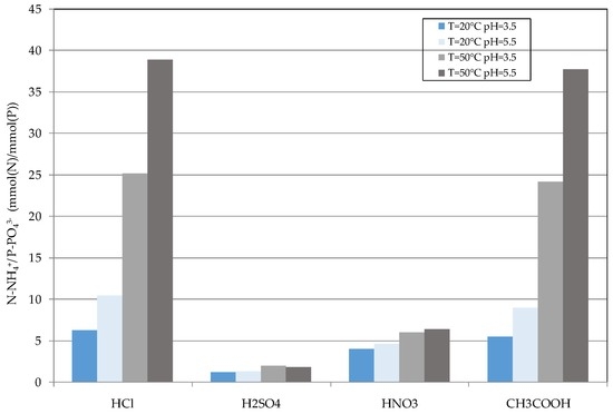 In order to define the optimal procedure for struvite decomposition, the effects of temperature, pH, and acid type were investigated. In particular, the experiments were carried out at 20 °C and 50 °C, at pH of 3.5 and 5.5, and using both inorganic and organic acids. Specifically, H2SO4 (95%), HCl (32%), HNO3 (60%), and CH3COOH (80%) were applied as solubilizing agents.