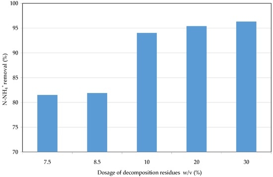 The first tests were conducted to identify the optimal quantity of wet solid, obtained through the defined decomposition procedure, for ammonia removal from raw landfill leachate. In this regard, amounts of 7.5%, 8.5%, 10%, 20%, and 30% (w/v) of wet residues were used to treat 200 mL of leachate at pH = 9. The experimental results showed that NH4+ abatements of about 82% can be obtained by using amounts of struvite residues up to 8.5% (Figure 10). The efficiencies increased up to around 94% with the dosage of 10%, beyond which only further restricted performance increases were observed.