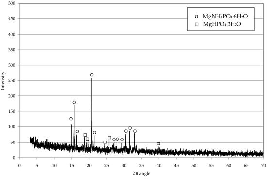 The X-ray diffraction (XRD) analysis showed the appearance of typical peaks of newberyite (MgHPO4∙3H2O) [21] and a substantial intensity reduction of peaks of struvite with respect to those observed on precipitate before the acidolysis (Figure 9). These results confirm that, in proper acid conditions, part of struvite is converted in hydrated magnesium phosphates with the release of ammonium in the acid solution, according to the following reaction: