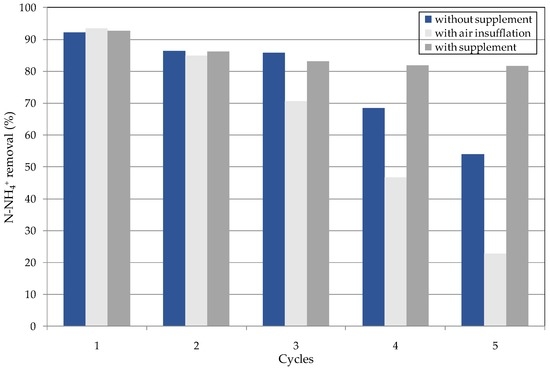 The experimental results showed that, during the first reusing cycle, the ammonium removal was around 92% for each operating method tested (Figure 12). Without supplementation of reagents and by setting the pH with NaOH, the process performance resulted in around 86% for the second and third cycle, and then gradually decreased to about 54%. The performance reduction is a consequence of a progressive decrease of the precipitate that was produced from each treatment (Table 2). This reduction caused a corresponding decrease of solid residues obtained during the decomposition steps (Table 2). Consequently, the availability of reactants in the subsequent cycles for leachate treatment progressively diminished. This effect was more marked in the tests with air insufflations (Table 2). Indeed, with this operating modality, the NH4+ abatements decreased more quickly to an efficiency of only about 23% in the 5th cycle. Thus, the detected trends prove that the pH correction through chemical addition is more favorable for the treatment of leachate using struvite decomposition residues. Indeed, in the tests conducted by means of air insufflation, a lower settleability of solids formed was observed in each cycle. This, clearly, makes the phases of recovery and reuse more difficult. The process with the supplementation of proper amounts of magnesium and phosphorus source was much more effective. In fact, by dosing the reactants at molar ratios of only n(N):n(Mg):n(P) = 1:0.05:0.05, the ammonium removal was constantly maintained at approximately 82% (Figure 12).