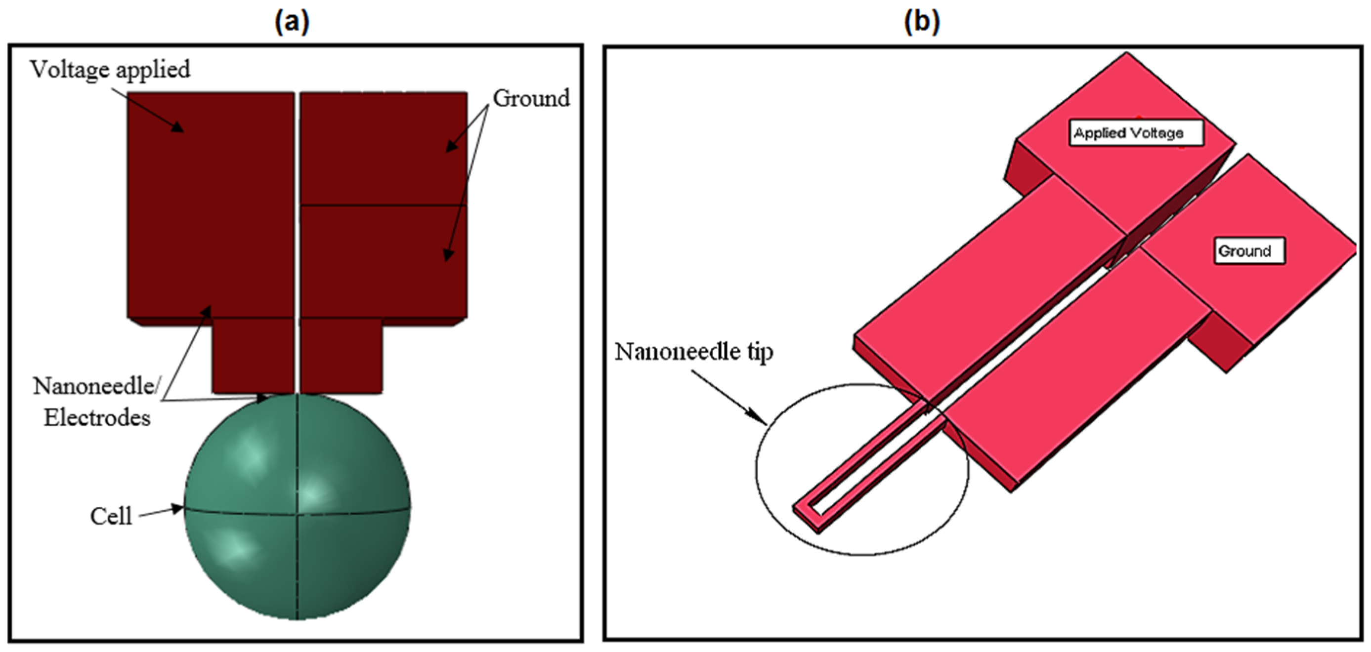 Figure 14a,b. From the results, the color legend clearly showed that the current passed through the nanoneedle and was absolutely independent of the cell conductivity. In addition, the direction the current took to reach the ground shown in