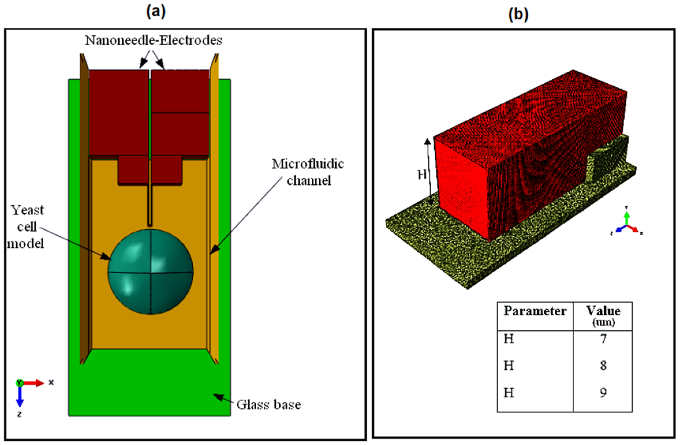 The nanoneedle design included a study on two parameters: the shape and size of the sensor, which had the best current density distribution and caused minimal damage on the saccharomyces cerevisiae cell under study. Then, the characterization analysis were on thermal-electric and mechanical characterizations to assess the ability of the nanoneedle to respond to temperature change as well as the nanoneedle’s sustainability against external forces. Furthermore, the ability of nanoneedle to measure the temperature of a single cell was performed. Two factors were analyzed to effectively characterize the intracellular temperature of a single cell. The first factor was to test the effect of the cell conductivity on the nanoneedle performance, and the second was to evaluate the sensor sensitivity and response time to temperature change in the range of 24–60 °C. Lastly, the integration of the nanoneedle to a microfluidic channel required a study on the cell flow rate which was influenced by the microfluidic channel cross-sectional area and the fluid velocity.