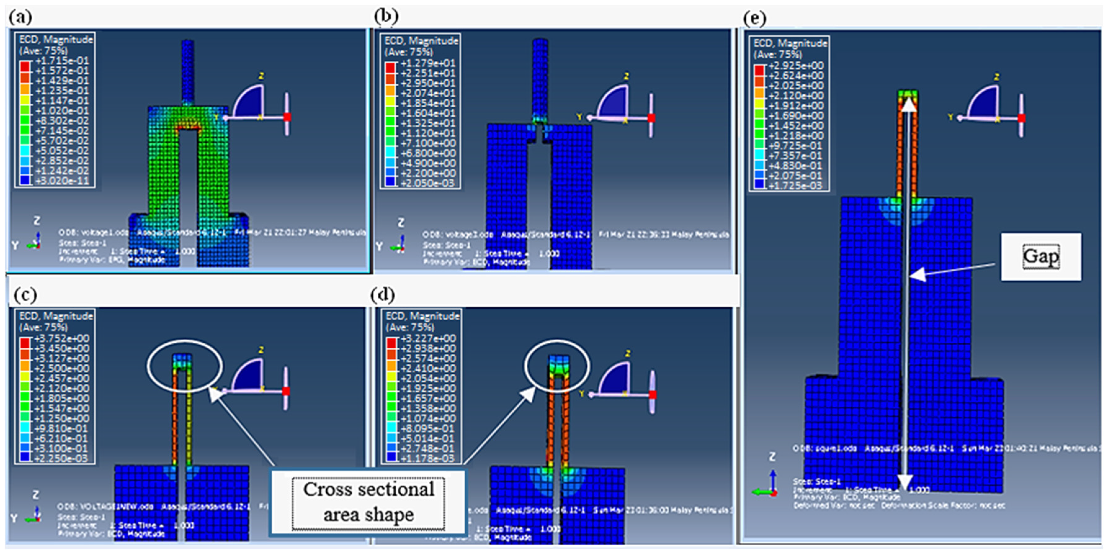 Figure 8 illustrates the simulation results of the first stage of the designing process, covering mainly the nanoneedle design. The gap was the first factor considered in the analysis, as it is evident in