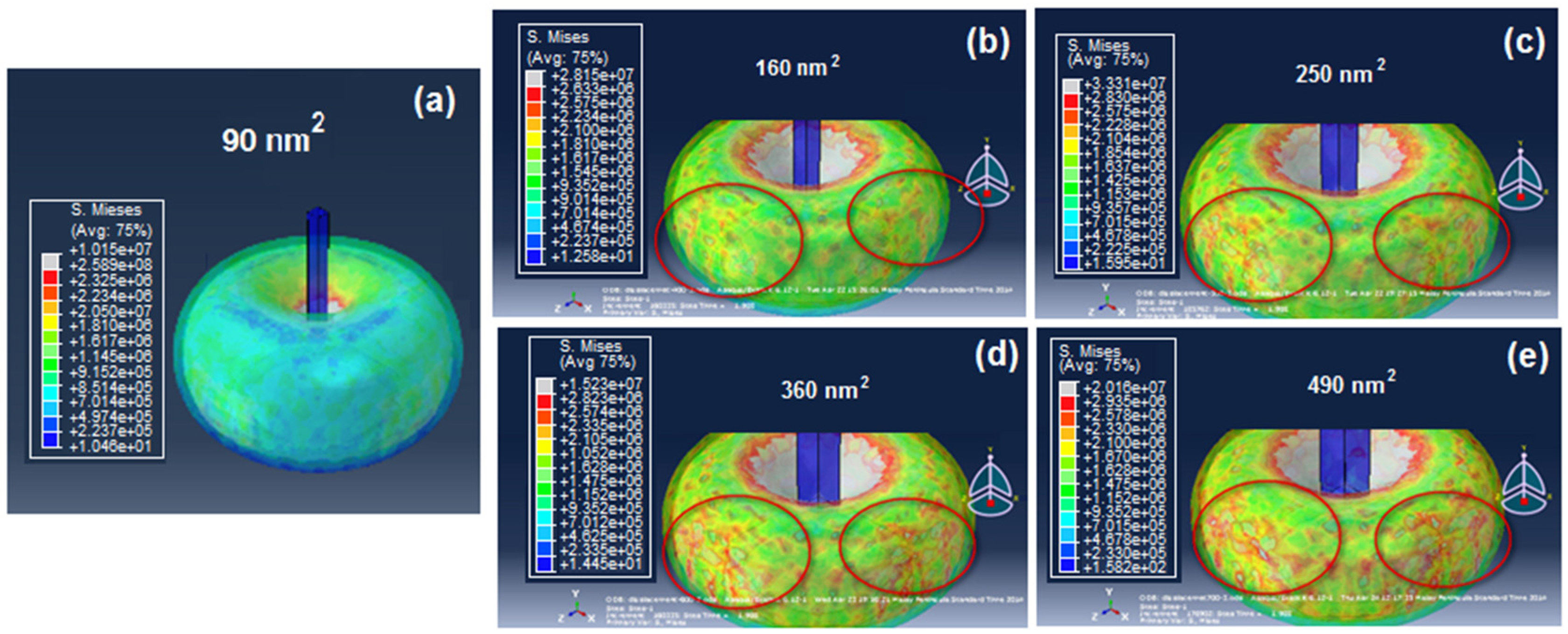 Figure 9a–e). As can be seen, all the nanoneedle sizes could penetrate the cell with the same applied force without causing any immediate bursting. However, the damage (scale of 0 in blue color and 1 in red color) of the inner part of the cell wall (marked in red circles) increased as the cross-sectional area of the nanoneedle increased. This can be explained by the increased pressure on the cell when a larger surface is pressing against it. From the