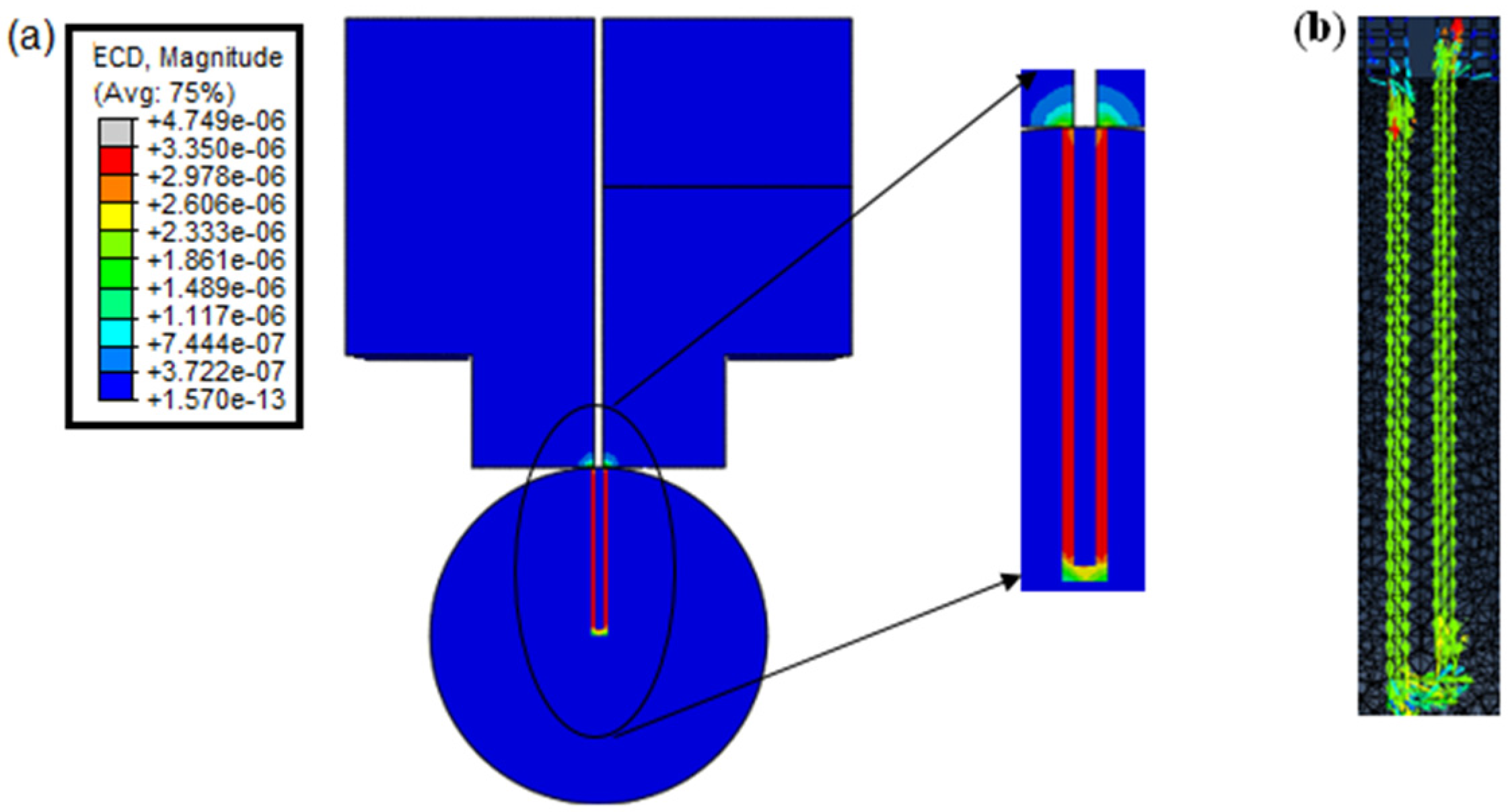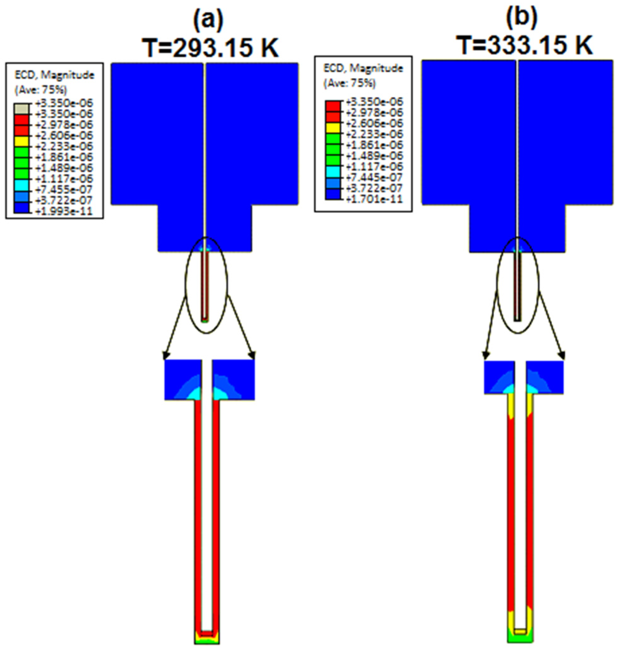Figure 10a,b present the simulation results of the current density of the nanoneedle defined at 293.15 K (room temperature) and 333.15 K. It was observed from the results that the intensity of current density decreased as the temperature increased. The behavior was the same as the resistance temperature detector’s (RTD) response to temperature, which confirms the concept.