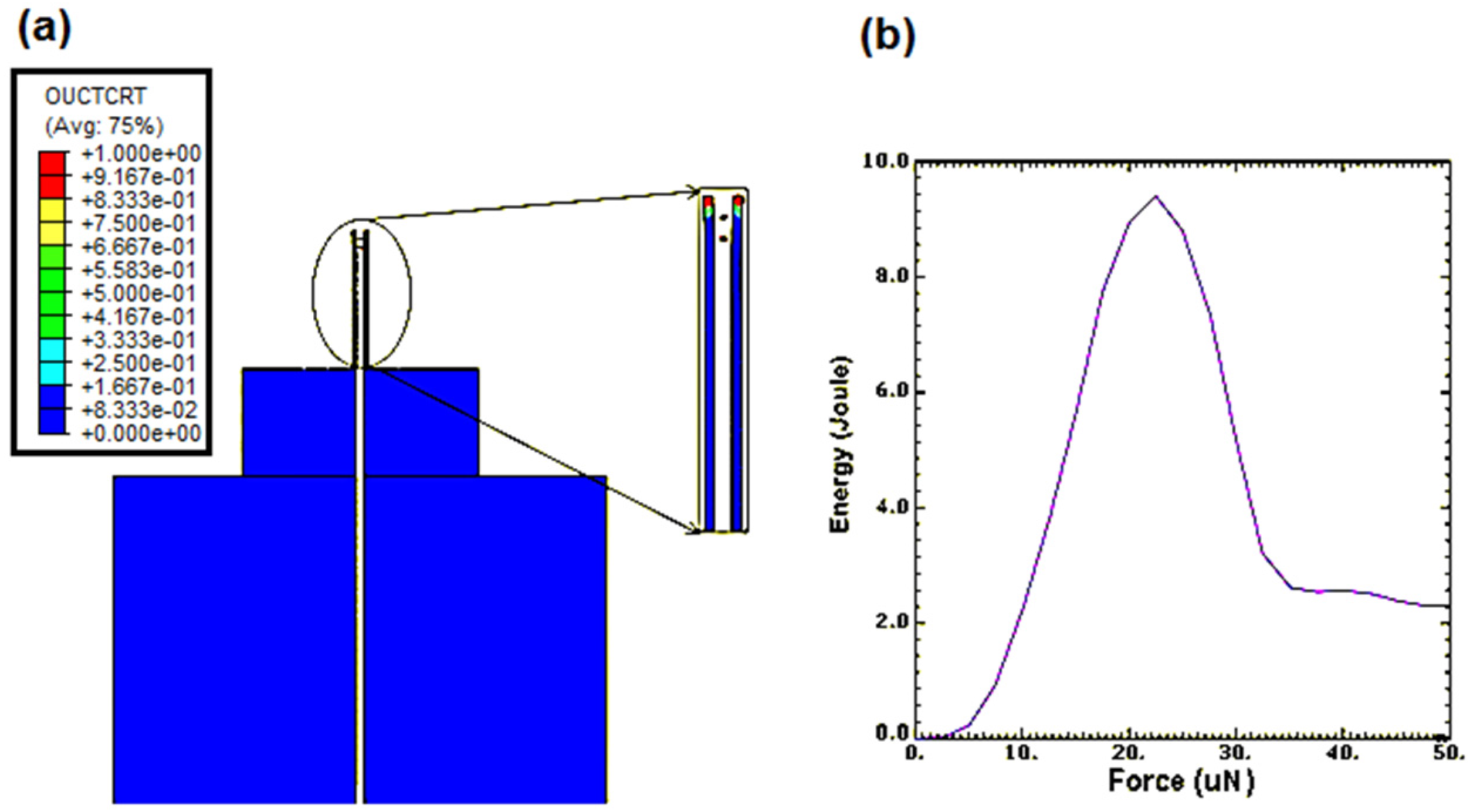 Figure 12a shows the results of the nanoneedle damage. The maximum force that can be applied to the nanoneedle was 22.5 μN. This is sufficient for the purpose of cell penetration in particular yeast cell, as it has been proven that a force of up to 1 μN was needed for yeast cell penetration [