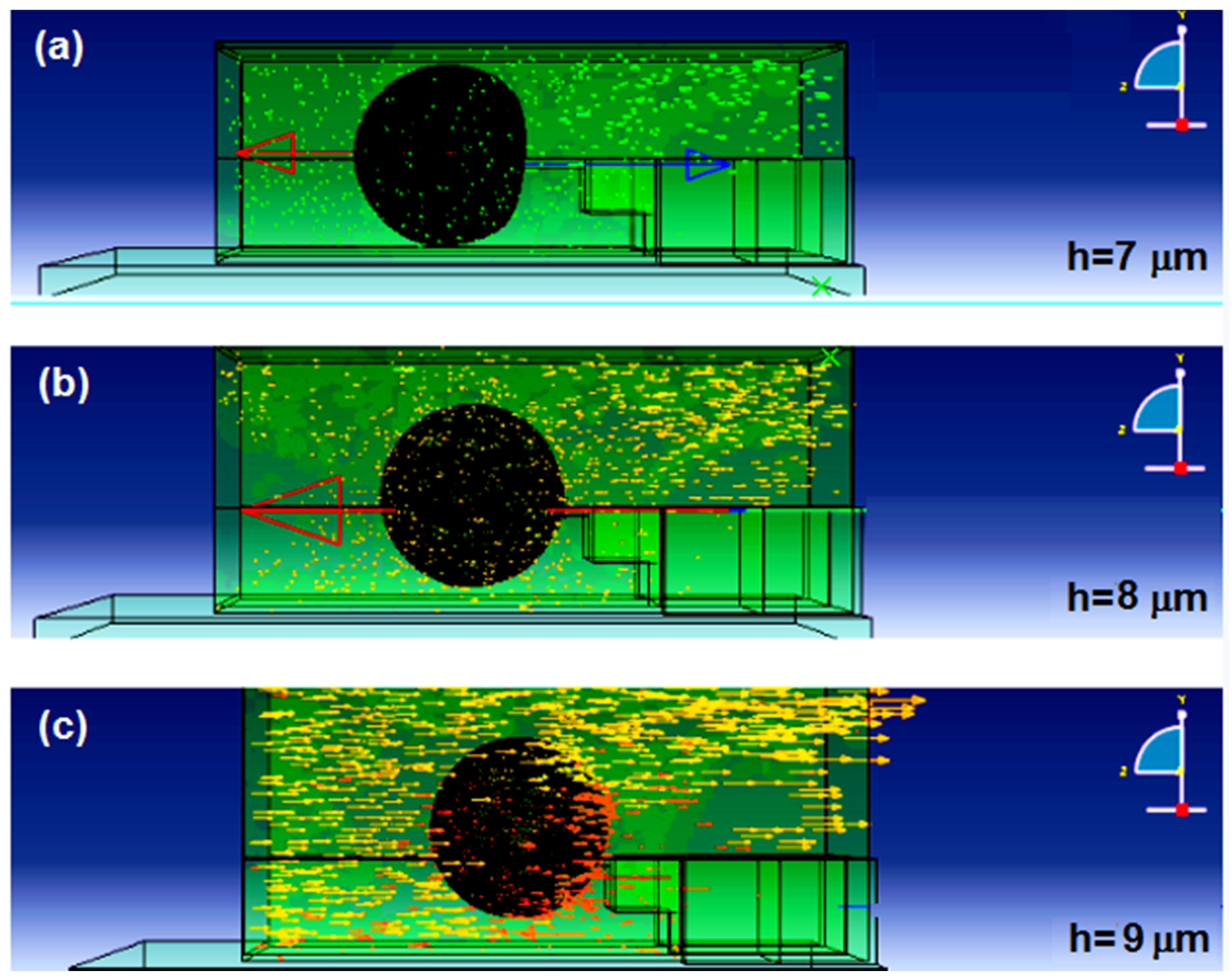 Figure 17 shows the simulation results of the microchannel height optimization analysis. The channel height had a strong effect on the cell flow and penetration into the nanoneedle. The higher the height, the better the flow was and the more penetration was observed on the cell. This could be explained by the effect of the water flow distribution that was disturbed by the electrode structure in the microchannel (
