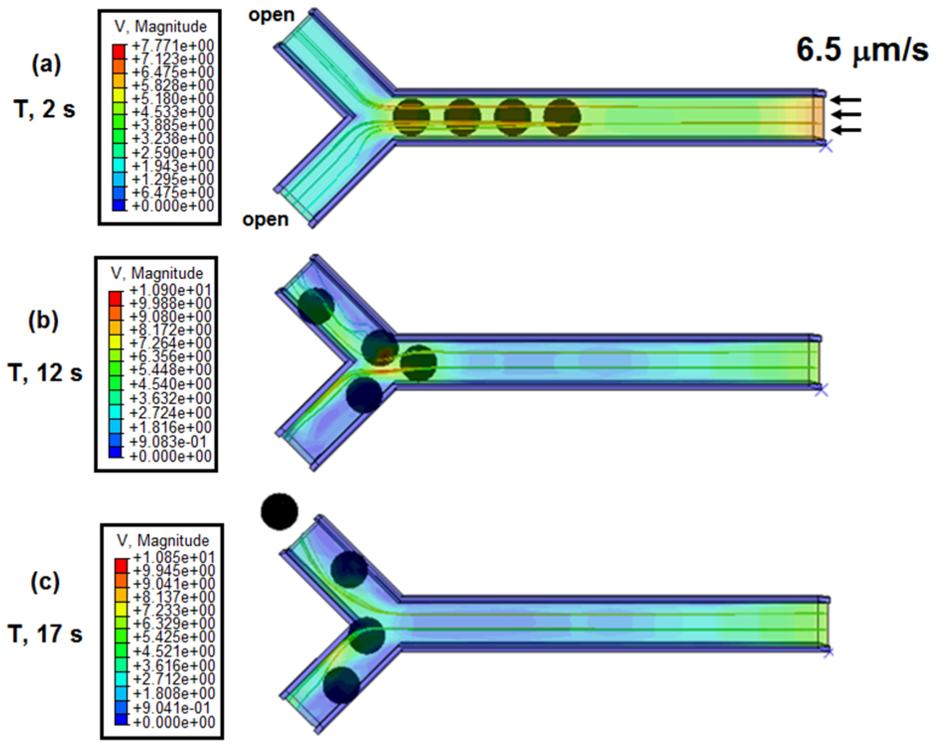 Finally, the velocity of 6.5 μm/s that was optimized in the last section was applied at the inlet. The streamline plot of the water flow in the Y-shaped microchannel at the time of 5 and 35 s are shown in