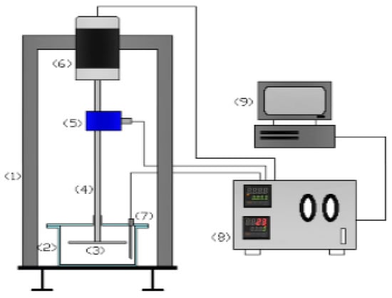Schematic diagram of rotating disk apparatus (RDA). Legend: (1) Outside frame, (2) fluid container, (3) rotating disk, (4) disk holding shift, (5) torque sensor, (6) electric motor, (7) thermocouple, (8) controller interface, and (9) PC.