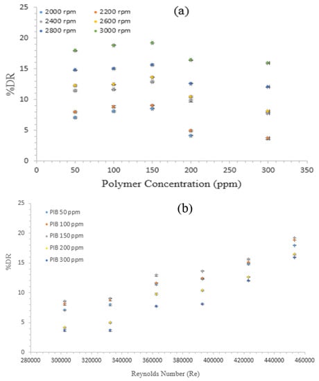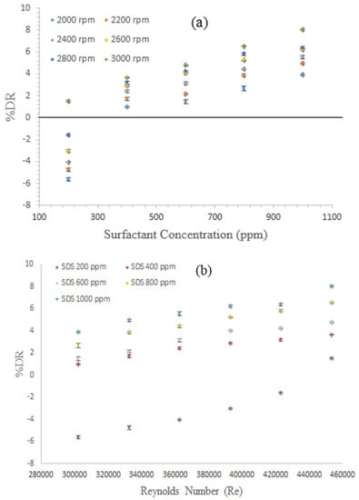 Figure 3a depicts the effects of the SDS concentration on %DR as a function of rotational velocity, while Figure 3b shows the effect of the Re on %DR with different surfactant concentrations. Evidently, %DR increased with the SDS concentration because surfactant working mechanism could be based on the increase in drag reducer molecules, which is favored by the increase in their respective concentrations. Apart from such observation, %DR evidently increased with the rotational speed. This quality could be attributed to the capability of the surfactant to self-repair (micelles formation) and return to its original form after passing through the high shear stress regions. The average distance between micelles is substantially small and difficult to break by strong turbulence eddies and shear stress. In addition, no DR was observed at 200 ppm for all rotational speeds except at 3000 rpm, where %DR was approximately 1.5%. The negative DR is due to the relation between the degree of turbulence and the DR effect of the polymer or surfactant additives. DR occurs when an external or additional effect (additives) acting within the flow media will change the flow behavior and degree of turbulence in a manner that can reduce power dissipation. Such activity happens when the external effect balances overcome the internal effect (turbulence). In many cases, the DR technique fails to act because this balancing effect is not reached, although the degree of turbulence in many cases plays a significant role in controlling the DR performance. Hence, the negative readings were observed in cases where the surfactant concentration was unsuitable to suppress turbulence and started to show negative performance by creating considerable turbulent and resistive motion. The highest %DR achieved by using SDS was approximately 8.03% at concentrations of 1000 ppm and angular velocity of 3000 rpm. From Figure 2 and Figure 3, we can conclude that both PIB and SDS were able to reduce drag; however, DR of PIB is more pronounced than that of SDS. This outcome could be the result of the viscoelastic nature of the polymer, which is limited with the surfactant.