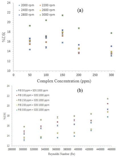 Effects of (a) complex mixture concentrations (five PIB concentration + 1000 ppm SDS) and (b) Re on %DR of diesel fuel with complex additives.