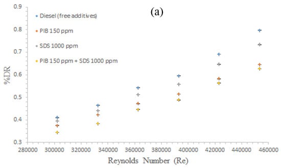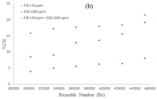 Figure 5a shows a comparative study of various best additives that were investigated while considering their torque with respect to Re. Overall, all materials showed torque increase with the corresponding Re increase. From the data obtained in the present study, the best performance in this respect was obtained for the complex mixture of PIB 150 + SDS 1000 ppm. Next was PIB at 150 ppm and the least DR was only obtained for the SDS at 1000 ppm despite the high concentration of SDS at approximately 1000 ppm. PIB of only 150 ppm was observed to show a better performance than SDS. This observation further confirms initial observations and conclusions that the DR efficiency of polymers is greater than that of the surfactants [].