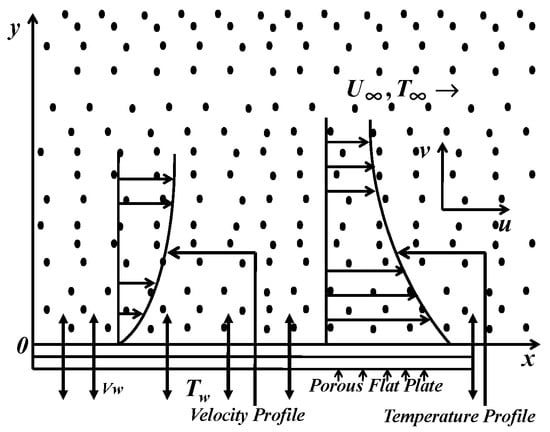 The heat transfer due to fluid flow is an important factor in problems in industries, such as heat exchangers, the recovery of petroleum resources, fault zones, catalytic reactors, cooling systems, electronic equipment manufacturing, etc. The heat transfer characteristics in the boundary layer are influenced by a number of factors, including flow geometry, the viscosity of a fluid, thermal conductivity, bounding surface characteristics, boundary conditions, flow medium and the orientation and intensity of the applied magnetic field [1,2,3]. Maxwell first proposed that the thermal conductivity of the fluid can be increased by including solid particles in the flow domain [4]. Following Maxwell, extensive research has been conducted to study the heat transfer characteristics of fluid flow in a porous medium. It is beyond the scope of this work to revisit the vast amount of literature on different Newtonian and non-Newtonian fluids’ flow within a porous medium. A comprehensive literature on forced/natural convective heat transfer in porous medium can be found in [5,6].