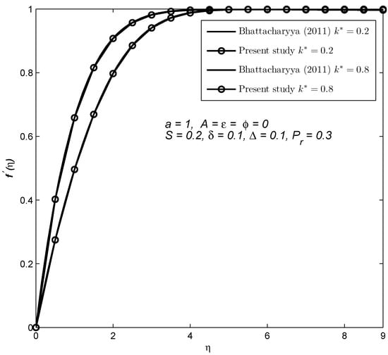 In order to solve the initial value problem (19)–(21) with the shooting method, we require an initial guess for and . The required values of and are chosen randomly, and numerical solutions are obtained using fourth order Runge–Kutta method. The numerical values for and are adjusted using Newton’s method to give better approximation to the solution. The step size is taken as , and the process is repeated until the solutions achieve the accuracy of . To ensure the numerical accuracy, we have compared our results with the results of Bhattacharyya et al. [43] for velocity and temperature profiles with and . The comparison is shown in Figure 2 and is found to be in excellent agreement.