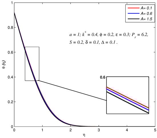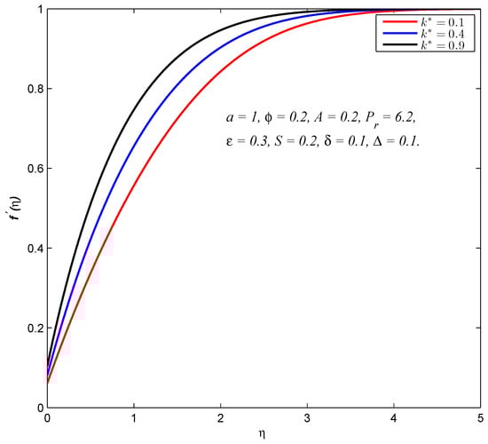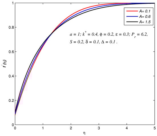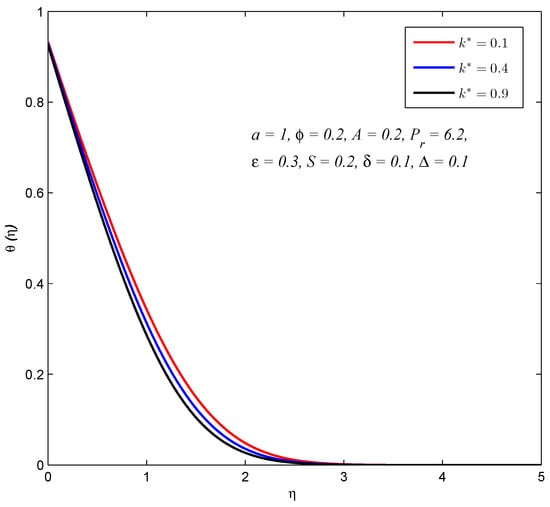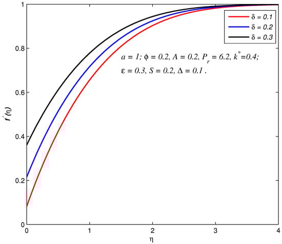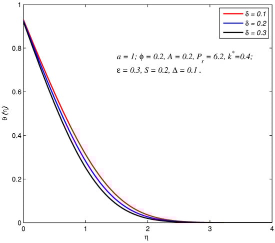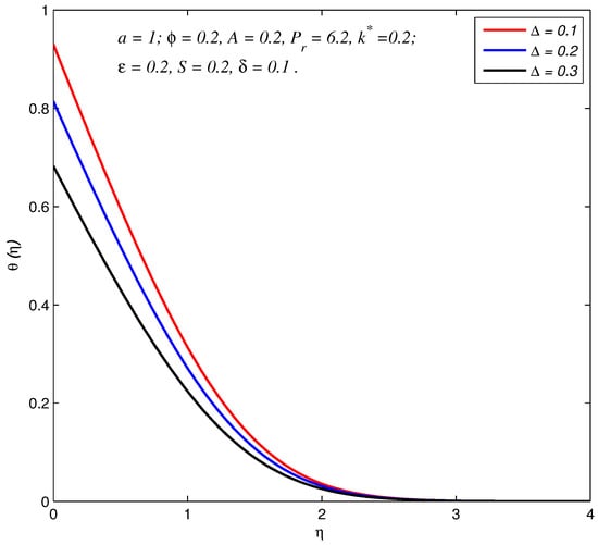 Figure 13 depicts the decrease in the thickness of the thermal boundary layer with the increase in thermal slip parameter Δ. This is because the increase in the thermal slip parameter causes less transfer of heat from the sheet to the fluid, which leads to a decrease in the boundary layer temperature. Moreover, the momentum equation is dependent on , but no significant effect of thermal slip parameter Δ on the velocity profiles is noticed.