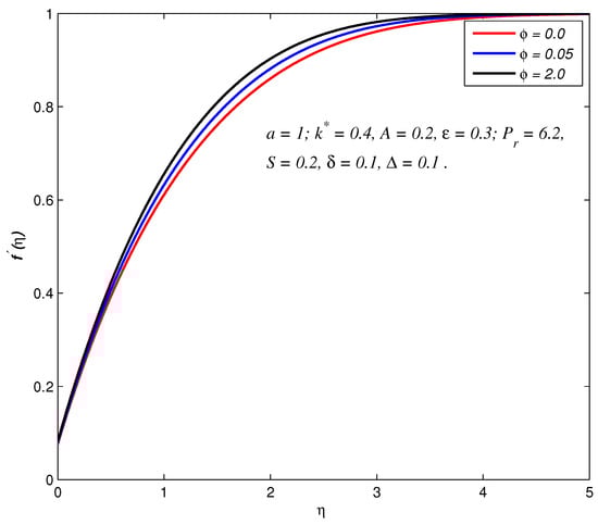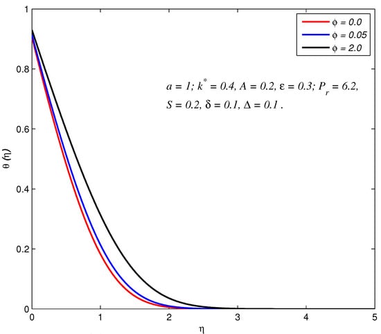 The effect of nanoparticle volume concentration parameter on the velocity and temperature profiles of the Cu-water nanofluid is shown in Figure 5 and Figure 6. It is observed that the velocity of the fluid decreases, whereas the temperature of the nanofluid increases with the increase in volume concentration parameter . This illustrates the agreement with the physical behavior of the nanofluids, i.e., the increase in the volume of nanoparticles causes an increase in the thermal conductivity of the fluid, which leads to the increase in the thickness of the thermal boundary layer.