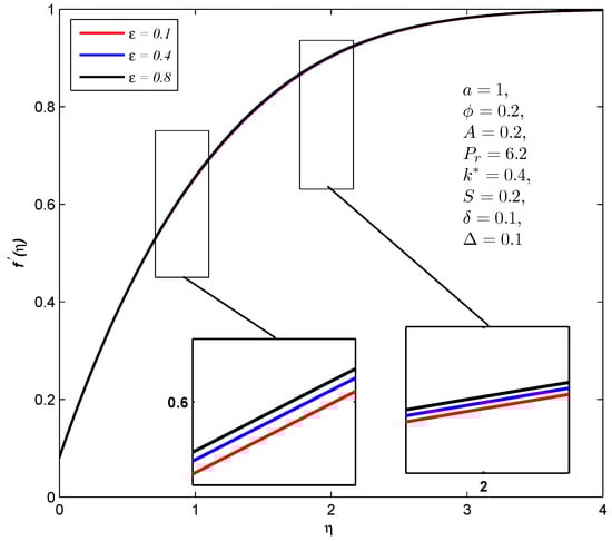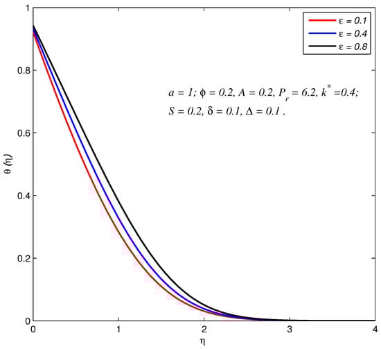 Figure 9 and Figure 10 depict the velocity and temperature profiles for the specified values of thermal conductivity parameter ϵ. It is noticed that the variation in ϵ greatly affects the temperature profiles, as compared to the velocity profiles. The variation in velocity profiles show an opposite effect as the variation in viscosity parameter A, i.e., the increase in thermal conductivity initially causes the decrease in fluid velocity and shows the opposite behavior after the cross-over point; whereas an increase in ϵ results in an increase in thermal conductivity, thereby raising the fluid temperature across the boundary layer. It would also increase the thermal boundary layer thickness.