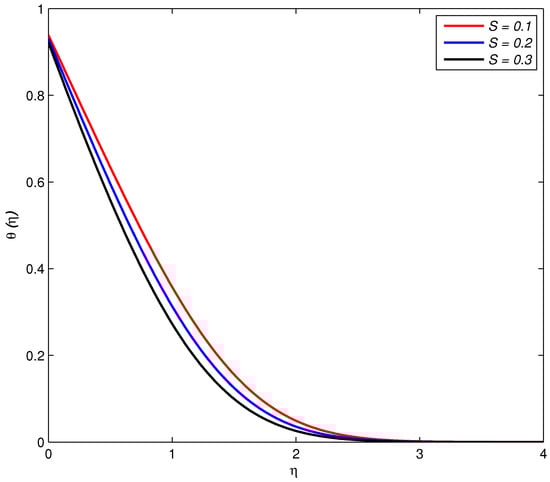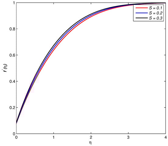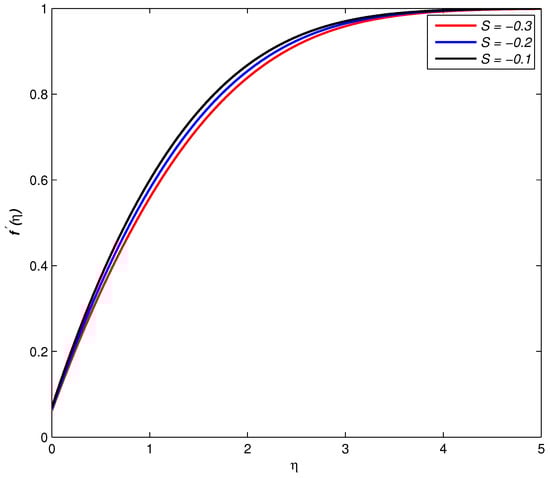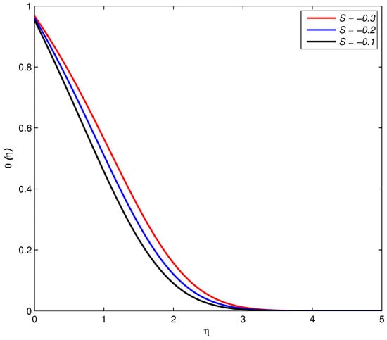 The behavior of the velocity and temperature distribution for variation of suction and blowing parameter in the presence of slip conditions at the boundary are plotted in Figure 14, Figure 15, Figure 16 and Figure 17. For , the fluid velocity increases as the fluid particles are sucked in the porous wall, which in turn reduces the thickness of the momentum boundary layer. On the other hand, for the case of blowing, i.e., the opposite trend is observed. When suction is increased, it refers to bringing the fluid close to the wall. This causes a decrease in the temperature profile and also decreases the thermal boundary layer. This entire phenomenon causes an increase in the rate of heat transfer. An opposite trend can be seen for the case of blowing
