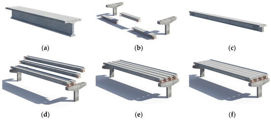 Concept of a modular bridge: (a) Standard module fabrication; (b) Module transport; (c) Longitudinal module connection with prestressing; (d) Module setting; (e) Transverse lap splice; (f) Cast-in-place joint.