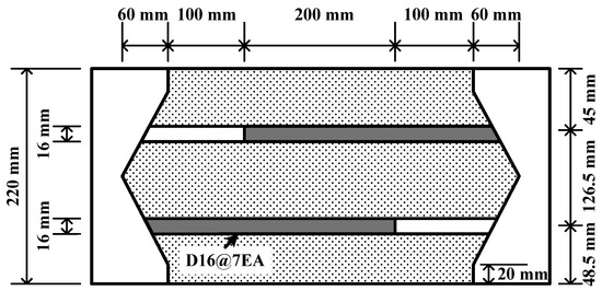 The differences in the joint width based on the change in the splice length of the reinforcement were compared with respect to the selected optimal cross section. For the ease of construction, the width of the transverse joint was set as twice the splice length considering the clearance. Table 7 summarizes the examined splice length and width of the transverse joint. In a manner similar to the original design, when a lap splice was applied, the width of the transverse joint decreased by 21.1% in the case of D16–6EA, and by 36.8% in the case of D13–9EA.