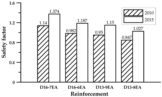 Figure 7 shows the change in the safety factor based on the change in the amount of reinforcement. Inappropriate results for the design standard (e.g., minimum spacing of reinforcement) were not considered. The original design involved a cross section with seven D16 reinforcements. The safety factor was less than 1 when the number of reinforcements decreased from seven to six; thus, it was inappropriate with respect to Code 2010. However, in the case of Code 2015, the safety factor corresponded to 1.187 even when the number of reinforcements decreased to six, and this indicated that it was safe. Additionally, when the type of reinforcement was changed to D13, Code 2010 was also inappropriate for the safety factor, but Code 2015 was appropriate, with safety factors that corresponded to 1.150 and 1.027 when nine and eight D13 reinforcements, respectively, were applied. Under the flexural performance condition (i.e., safety factor) similar to the original one, the number of reinforcements could be decreased by 14.3%, and the diameter of the reinforcement could be decreased by up to 18.0% and 27.0% for nine and eight D13 reinforcements, respectively.