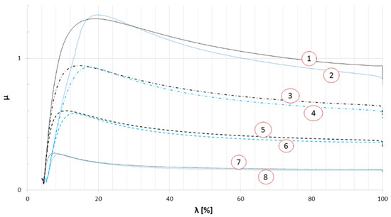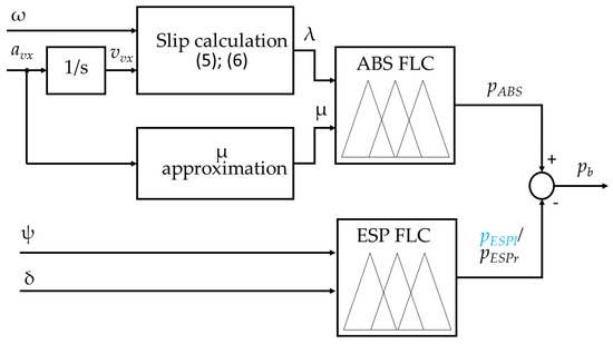 Figure 2, the front and rear wheels require different optimal wheel slip values. Therefore, the front and rear wheels will have different membership functions (MFs) for the λ input in ABS. Consequently, each wheel has a different controller. When the yaw FLC understands that the driver is losing vehicle control, it reduces the braking pressure from the side of the car, in which direction the vehicle starts to spin around its center of gravity (COG). Otherwise, only the ABS control is operating.