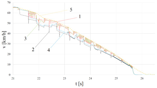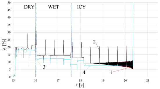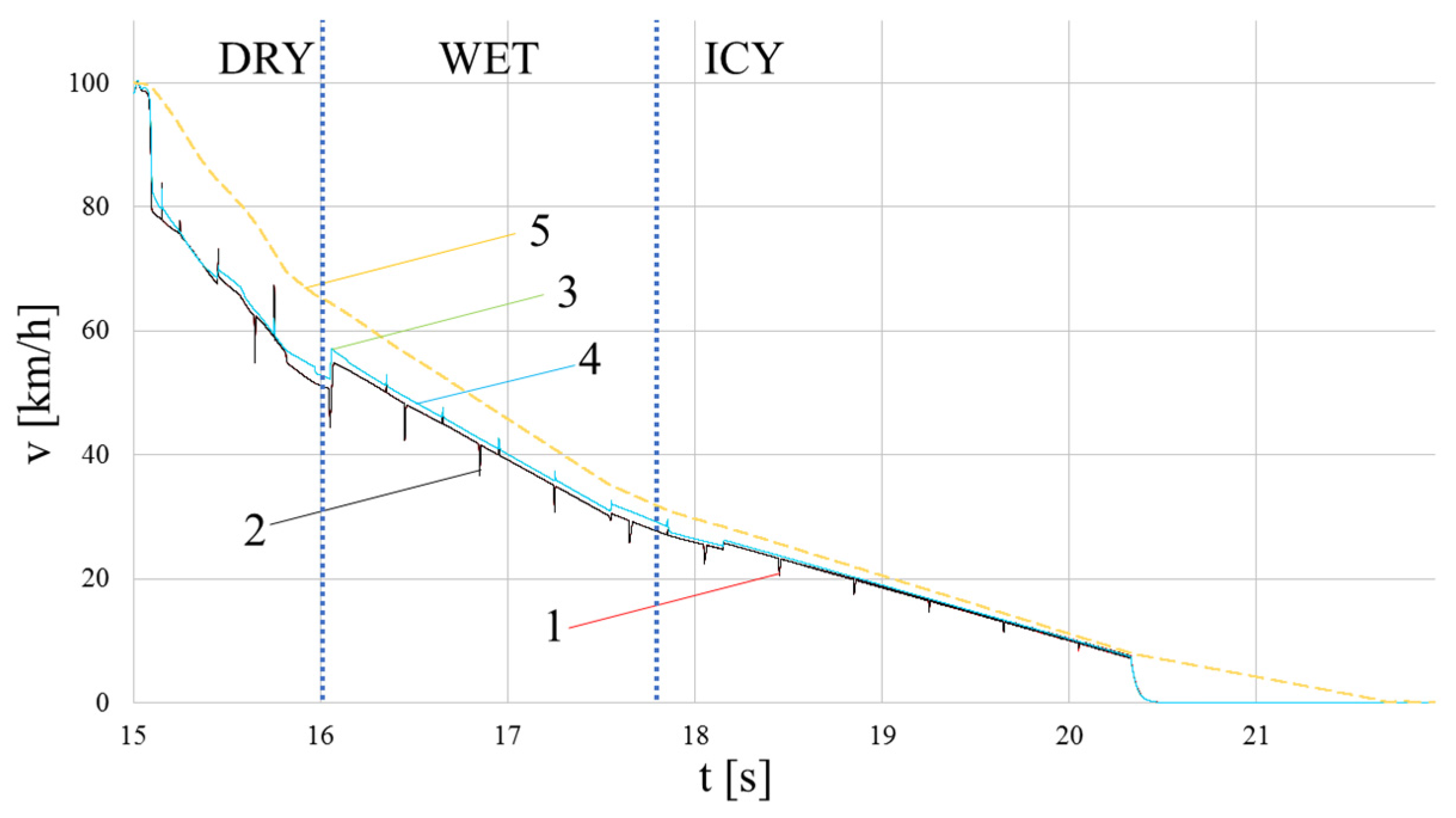 Figure 12. The vehicle starts braking on a dry road with transition to a wet surface. The car finishes braking on icy asphalt. The vehicle changes the deceleration according to the tire–road adhesive characteristics. The algorithm is able to recognize the road surface and, according to the obtained information supply, appropriate pressure to maintain efficient braking is applied.