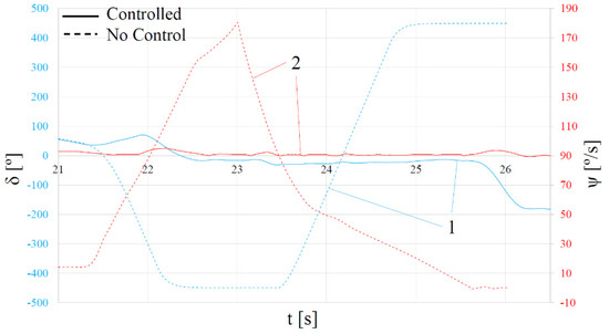 Figure 11, dashed lines), the vehicle spins left. The driver turns the steering wheel to the right until the maximum allowed angle. Nevertheless, the high yaw rate in the opposite direction makes the car spin.