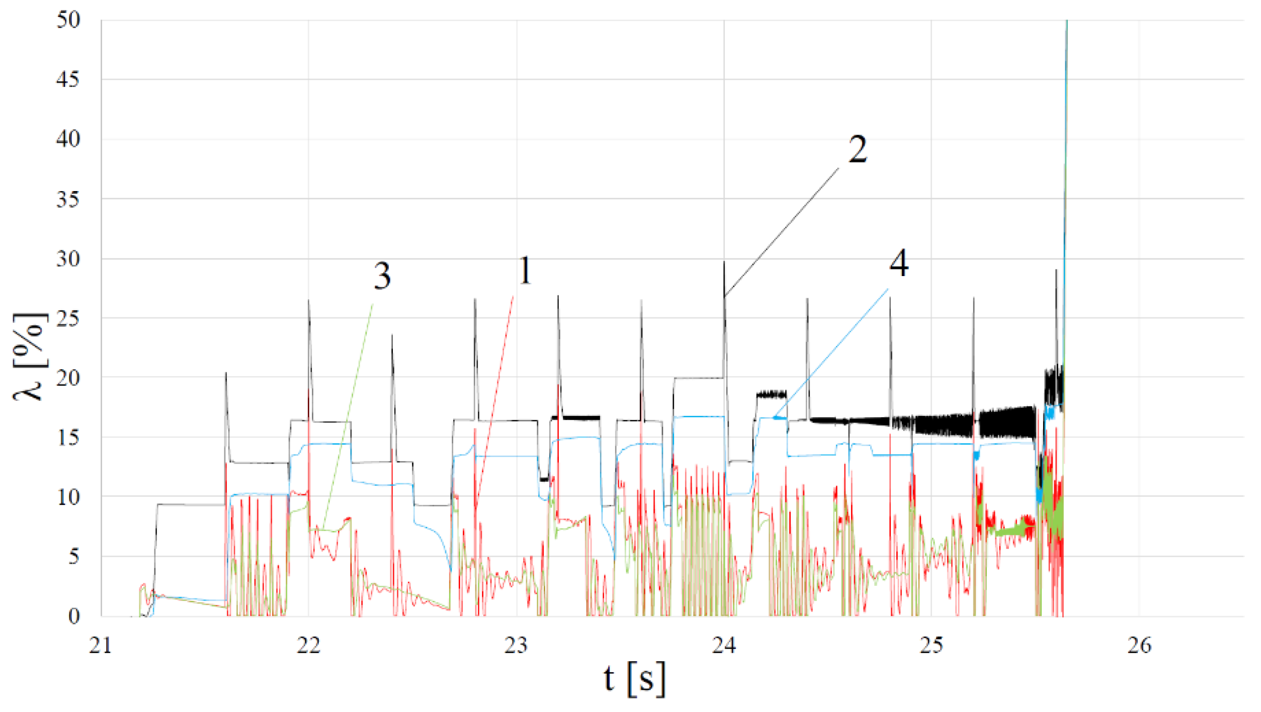 The reaction of the ABS controller on the wheel slip characterizes the system adaptability. The factor can be expressed in percentage and calculated by the following equation:
