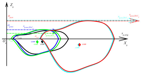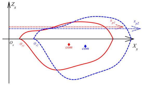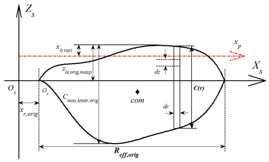 The complete wing planform outline, wing shoulder frame (XsOsZs) and some basic sizes are illustrated in Figure 1. Here, the intersection of Xs-axis and Zs-axis (Os) can be termed wing shoulder [1,28], so we term the coordinate frame of XsOsZs as wing shoulder frame (or wing planform fixed frame). We assume that in the initial case, Xs-axis of XsOsZs is aligned with pitch axis, where r is the radial distance along it. It is worth noting that the wing hinge always exists in the insect body, so the wing root coordinate offset distance between wing shoulder (Os) and wing root (Or), which is commonly necessary to design the airfoil of FWMAV in engineering, is termed xr,orig [29,30]. The variable pitch axis (xp) is schemed by the red dash-dotted line. Here, denotes the projected distance between pitch-axis and maximum variable leading-edge point. As a starting point, we choose the Xs-axis of the wing shoulder frame as the original location of the pitch axis, which corresponds to the non-dimensional value of 0.36 from the maximum leading-edge point. In other words, the original leading-edge profiles () and trailing-edge profiles () are prescribed in the wing shoulder frame firstly, then the value of 0.36 times the projected distance between maximum point on original leading-edge profiles and minimum point on original trailing-edge profiles relative to the original leading-edge profiles defines the initial pitch axis location, namely, zle,orig,maxp/Cmax,letotr,orig = 0.36 (Figure 1).