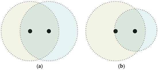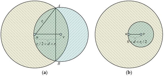 When the transmission ranges are reduced, the network topology is shown in Figure 2b. In Figure 2b, the distance (u, n) is d0 and the distance (n, v) is d1. Therefore, the coverage area of node n, node u, and node v can be calculated as: