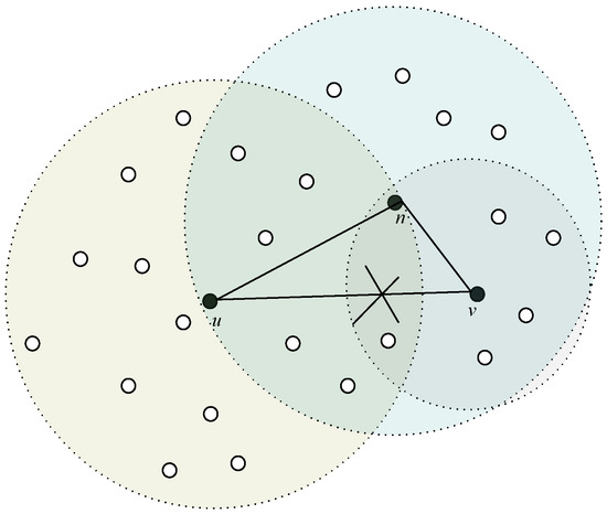 As discussed in Section 3, the interference of edge (u, v) is defined as the number of nodes that node u and node v covered. When the transmission ranges are reduced, node u and node v cannot communicate with each other directly; therefore, node n will be chosen as the relay node. The node n can communicate with node u and node v, respectively (see Figure 4). So the interference of link (u, n, v) will be: