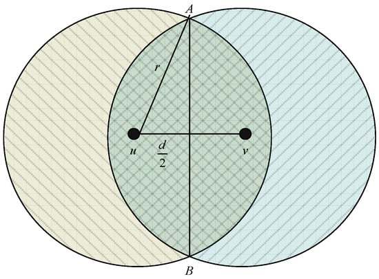 As shown in Figure 5, the distance between node u and node v is d; the intersection points of the overlapping coverage area are A and B, respectively. Thus, the acreage of the shade area in Figure 5 can be calculated as: