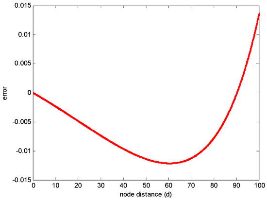 From Figure 6, we can conclude that with the increasing of k, the variance will obtain the minimum value when k is 1.93, which is consistent with the theoretical analysis in Equation (10). Figure 7 indicates that when the value of k is 1.93, the evaluation error between s and f is smaller than 0.015, which is small enough to be ignored. In addition, when , the variance and evaluation error are minimum simultaneously. Therefore, the Equation (11) can be used to evaluate two nodes’ overlapping coverage area in homogenous WSNs.