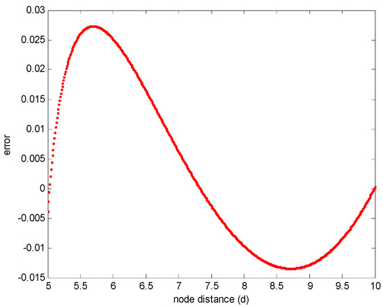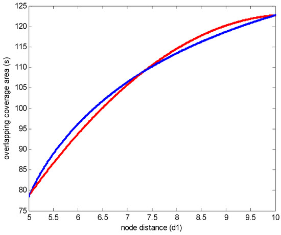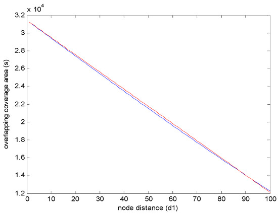 The simulation results of Equations (5) and (11) are shown in Figure 8. In Figure 8, the Equations (5) and (11) are fitted with small evaluation error. This indicates that in homogenous WSNs, the relationship between the overlapping coverage area and the node distance is linear.