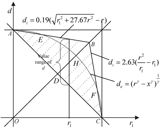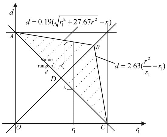 In the calculation of the coverage area, we assume that is larger than d1, i.e., , so based on Equations (16) and (17), the feasible region when is the triangle DBC in Figure 9.