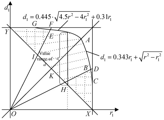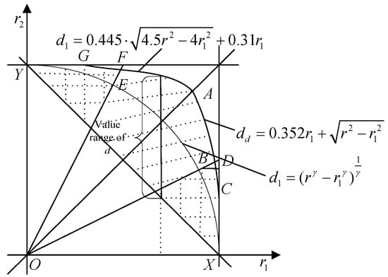 In Figure 9, when and d1 equal to the values in shade area, the network interference will decrease; otherwise, the interference will increase. In addition, the coordinate of B is (0.85r, 0.85r), so when , the value range of d1 is (, ); when , the value range is (, ), where AC represents the line in Figure 9.