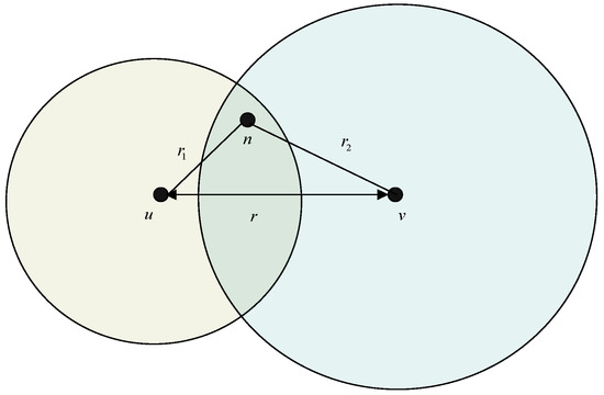 Additionally, in Equation (15), is the transmission range after being reduced and equal to the maximum value between distance (u, n) and distance (n, v). For instance, as shown in Figure 4, distance (n, v) is smaller than distance (u, n) and equal to d1; so is equal to distance (u, n) and larger than d1 (the situation that r1 is smaller than d1 will be investigated following). In this scenario, the transmission ranges of node u, node v, and node n are all the same and equal to .