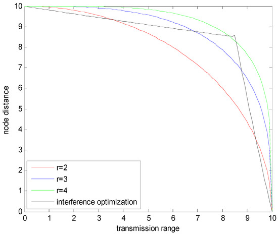 In Section 4.2, when the transmission ranges are different in the network, the feasible regions of interference-optimality and energy-efficiency are shown in Figure 18. Considering Equation (40), the boundaries of energy-efficiency and interference-optimality are shown in Figure 19.