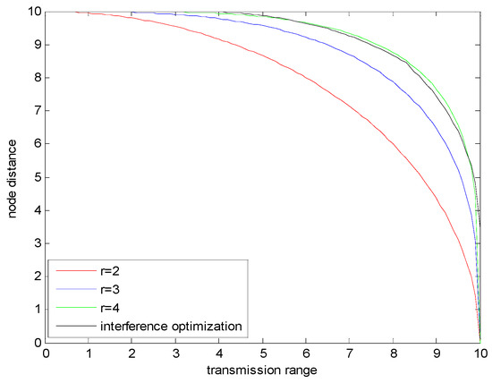 As shown in Figure 9, the probability that the distance between two nodes, , can be calculated by Equation (18). The probability that d1 satisfies the constraints shown in Figure 9 can be calculated by Equation (19). Then the probability that the network is interference-optimal by adjusting the transmission range is: