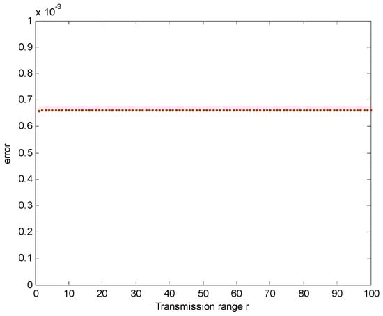 Similar to Figure 17, in Figure 19, when , the feasible region of energy-efficiency is the largest and approximately equal to the feasible region of interference-optimality. The evaluation error can be found in Figure 20. In Figure 20, when , the evaluation error between the feasible region of energy-efficiency and interference-optimality is only , which is small and can be ignored. Therefore, in heterogeneous networks, the probability that the network is energy-efficient and interference-optimal at the same time is approximately equal to 1. Consequently, we can conclude that in heterogeneous WSNs, when the network is energy-efficient, the network is interference-optimal, not vice versa.