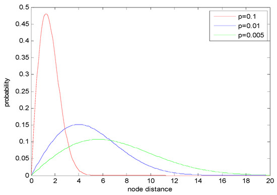 The PDF of the neighbor distance (shown in Equation (18)) can be found in Figure 21. The Figure 21 indicates that the distribution of the neighbor node distance is Rayleigh Distribution. In Figure 21, with the increasing of the node density, the maximum probability increases while the maximum neighbor distance decreases. The reason is that when the node density increases, more nodes are deployed in the same area, so the neighbor distances decrease. For instance, in Figure 21, when the node densities are 0.1, 0.01, and 0.005, the maximum neighbor node distances are 5, 15, and 20, respectively. The similar variation trend can be found in the neighbor node distances which have the maximum probabilities.