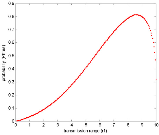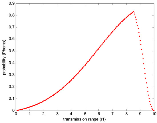 Similar to the homogenous network, in Figure 25, with the increasing of transmission range, the probability under specific transmission range increases from 0 to 0.82 and reaches the maximum value when the transmission range is 0.84r; the probability decreases when the transmission range is larger than 0.84r. Therefore, the maximum probability is 0.82 and the optimal transmission range is 0.84r in the homogenous network. This conclusion is interesting, since the maximum probability and the optimal transmission range are similar in homogenous WSNs and heterogeneous WSNs.