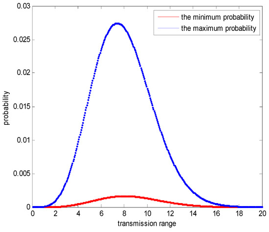 According to Equations (43) and (44), the maximum and minimum probabilities that the network cannot meet interference-optimality and energy-efficiency simultaneously can be found in Figure 26. In Figure 26, the node density is 0.01.