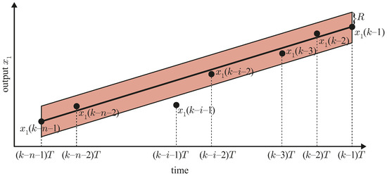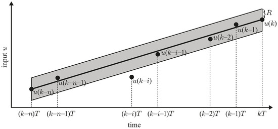 In FOAW, the current and previous input values are used for windowing, as shown in Figure 4. Specifically, the algorithm checks whether all of the points {} are inside the region constructed by the two end points and , and the parameter R, as shown in Figure 5. If it is the case, the window size n is further increased for providing a smoother signal. The increase of n is continued until at least one point of previous input values lies outside the region, as also illustrated in Figure 5, or n reaches its maximum value . Then, the last value of v obtained by the finite-time differentiation is provided as the output . In such a way, FOAW optimizes the tradeoff between the output smoothness and the suppression of delay.